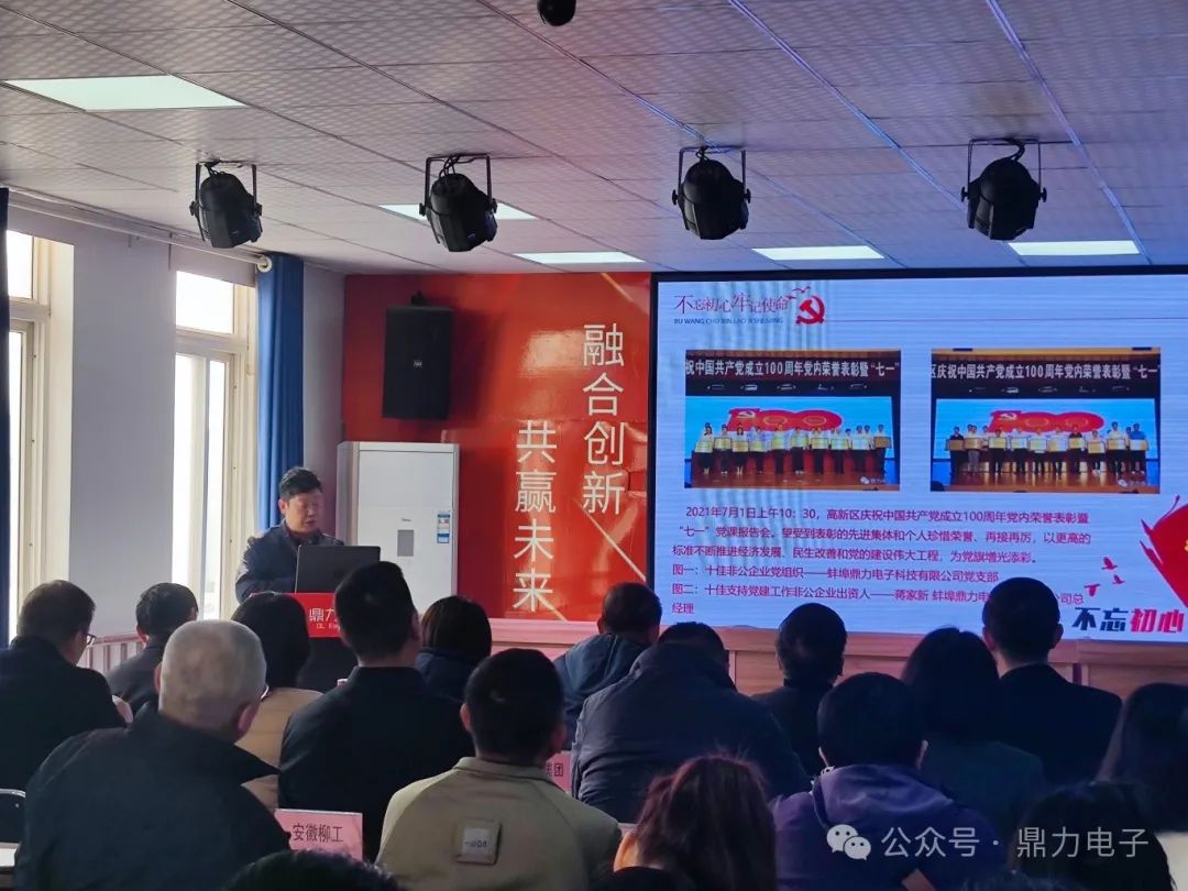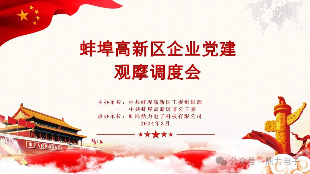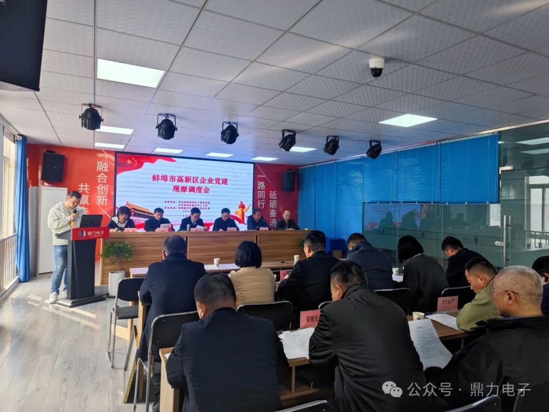 2024年3月28日下午三點,在蚌埠鼎力電子科技有限公司會議室召開蚌埠高新區(qū)企業(yè)黨建觀摩調度會,會議由張躍江書記主持,會議議程總共分為六個部分:鼎力電子黨支部匯報黨建工作開展情況;全區(qū)黨建工作示范點命名文件并授牌;區(qū)非公辦解讀黨建共建“七個一”工作要求;黨建指導組組長匯報工作開展情況;13個企業(yè)黨建工作示范點交流發(fā)言;會議總結點評。